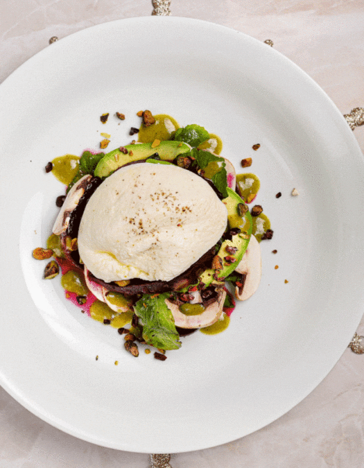 Ensalada de betabel con burrata, arúgula, hongos, pistaches y nibs de cacao
