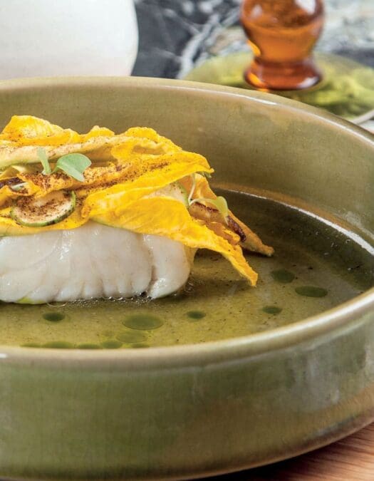 Pesca del día con huitlacoche, puré de maíz y flor de calabaza