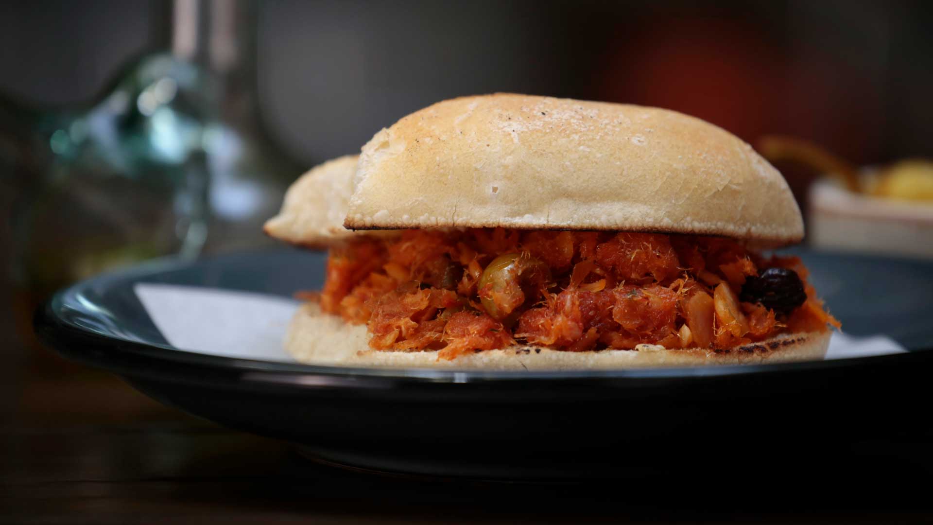 Sin duda, el bacalao a la Vizcaína es uno de los platillos navideños más queridos en nuestro país. Y si va servido dentro de un crujiente pan, el placer es mayor. La chef Liz Galicia, del restaurante Salón Mezcalli, en Puebla, nos comparte una receta que le encantará aún a quienes no son tan adeptos a este plato, porque su secreto es no dejarlo salado, además de que en lugar de bolillo, utiliza un pan de cemita. ¿Ya se te antojó? Aquí te dejamos la receta de cemita poblana de bacalao a la Vizcaína. Fotos: Gabriel Núñez.