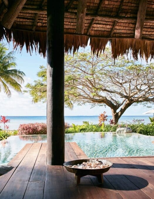 Shane Watson es el chef ejecutivo en el resort Likuliku Lagoon en Malolo Island, situado a unos 25 minutos en lancha rápida desde el aeropuerto de Nadi. Likuliku es un elegante resort de ambiente relajado, solo para adultos. En las habitaciones, diseñadas como los típicos bures (casitas con techos de paja) construidas sobre el mar, es posible caminar por la terraza y bajar por la escalera para sumergir los pies en la colorida agua llena de peces que yace debajo. Los bures frente a la playa están asentados entre jardines arbolados y florecientes. Además de contar con regaderas exteriores en sus propios patios, algunos tienen pequeñas piscinas privadas.