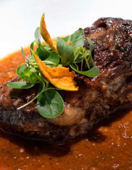 A su vez, la cegueza o mole de maíz está presente para convertirse en uno de tus favoritos. Se trata de un mole que anuncia el final de la cosecha del maíz, y en Guzina Oaxaca lo sirven con short rib, hoja santa y biuses fritos, que son carnitas fritas de retazo de chicharrón. La lengua es exquisita, y se prepara en barbacoa con un adobo especiado, cuya cocción lenta se traduce en suavidad, pero se termina con un ligero paso por el comal. Sus tortillas son una obra de arte, y son hechas por Lucy Aburto.